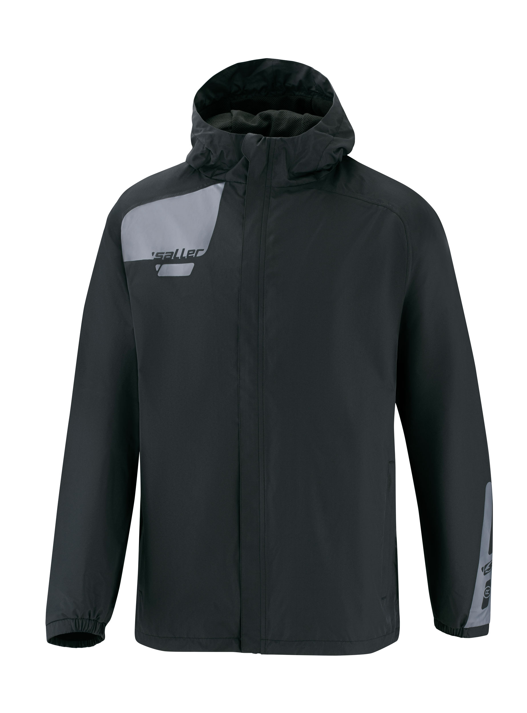Vysoce kvalitní nepromokavá bunda SALLER ESSENTIAL s povrchovou úpravou proti větru a vodě na vnitřní straně bundy je vhodná pro fotbalový trénink při nepříznivém počasí. V oblasti lopatek je umístěna síťovinová vsadka (podšívka). Dvě boční kapsy na zip, v límci je uschovaná kapuce a rukávy zakončeny lemem. V pase je stahovací šňůrka se zarážkou. Bunda je vodě a větruodolná.