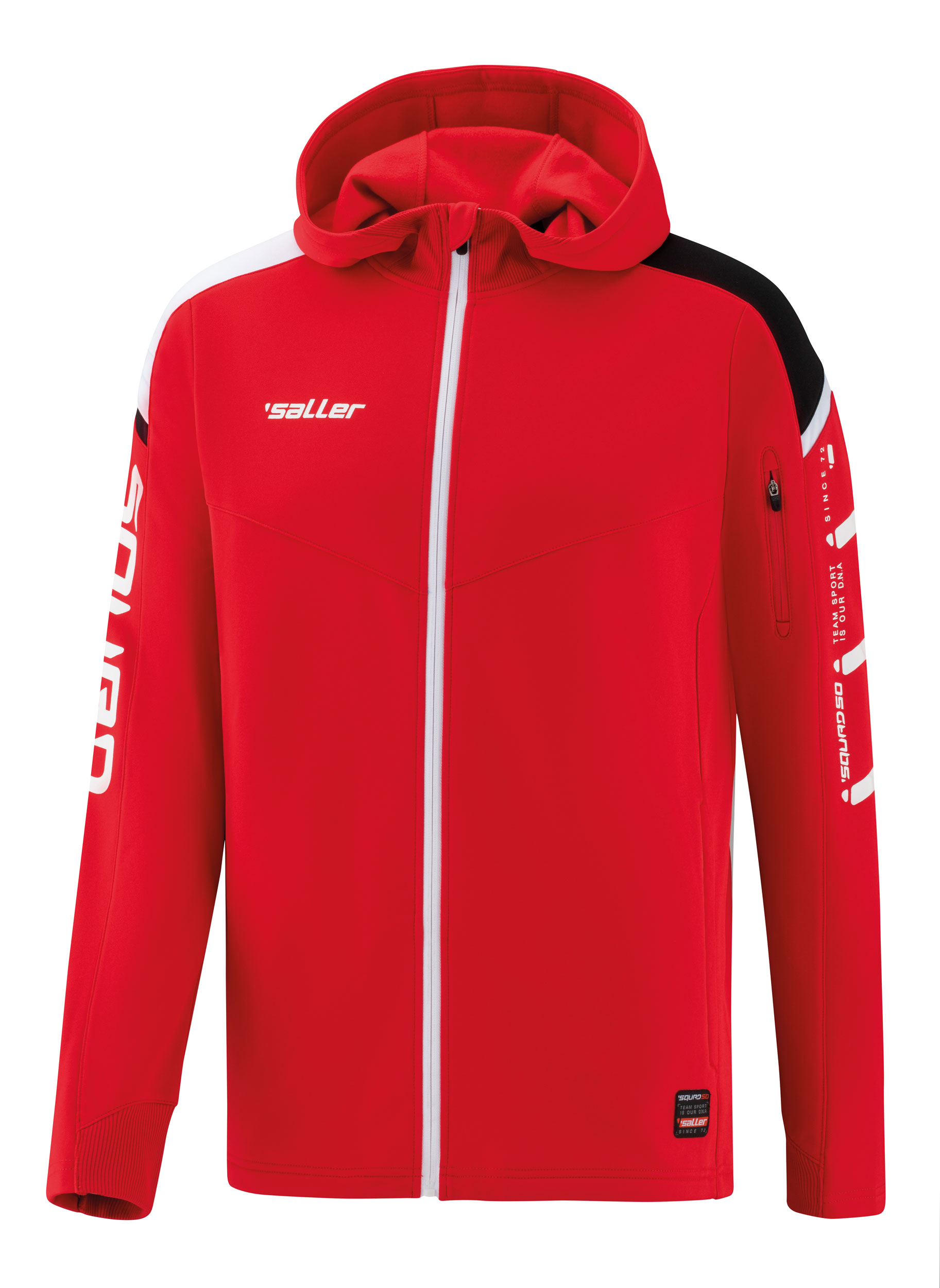 Mikinová bunda s kapucí SALLER SQUAD 50 v moderním střihu. Rukávy střiženy do raglanu. Bunda má kapuci, která je opatřena šňůrkou ke stažení. Vnitřek je z jemného flísového materiálu přijemného na nošení. Má dvě postranní kapsy na zip.